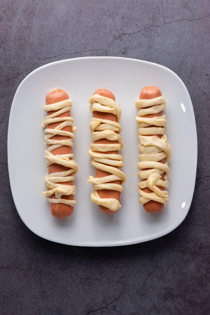 - Take one hot dog and start wrapping it with a crescent roll strip, leaving a small gap for the face. Continue wrapping until the hot dog is covered, resembling a mummy.