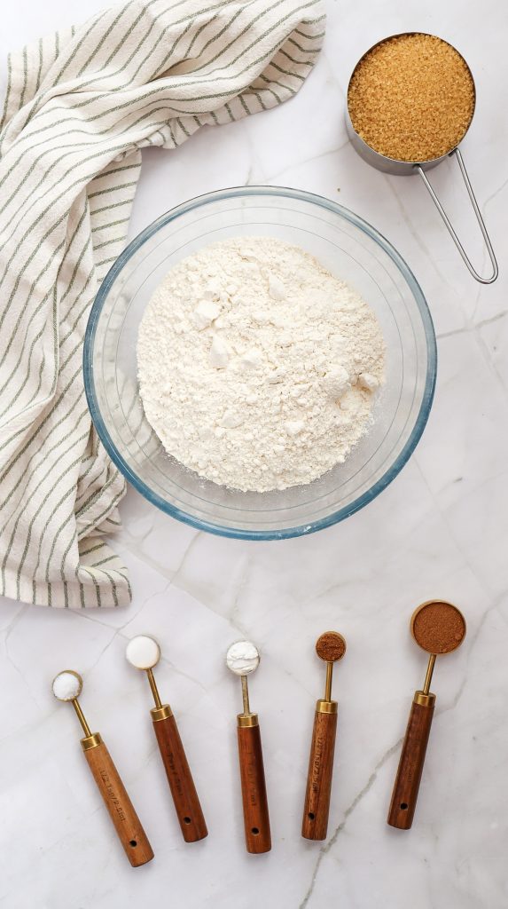 • Ina large bowl, whisk together the flour, brown sugar, baking powder, bakingsoda, cinnamon, nutmeg, and salt.