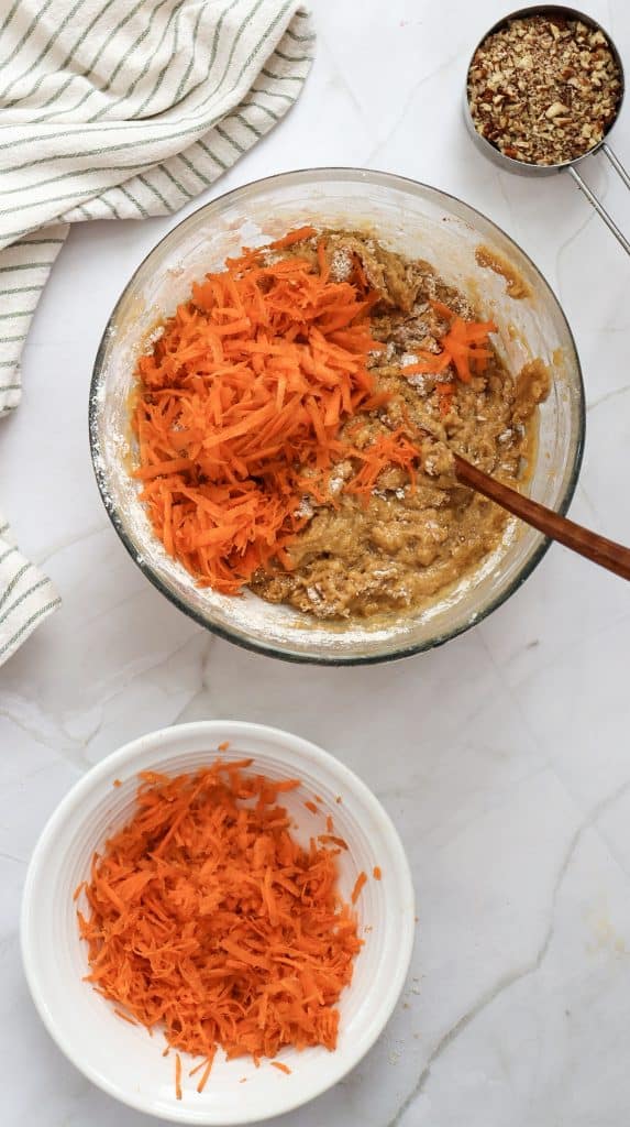• Fold in the grated carrots and nuts until evenly distributed.