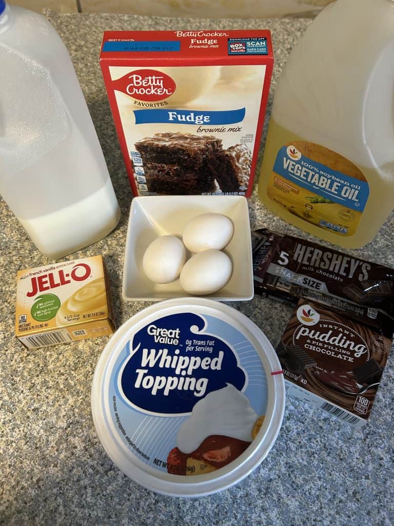 - Whisk together the chocolate and vanilla puddings with milk until smooth and thick. Spread the pudding mixture over the brownie.