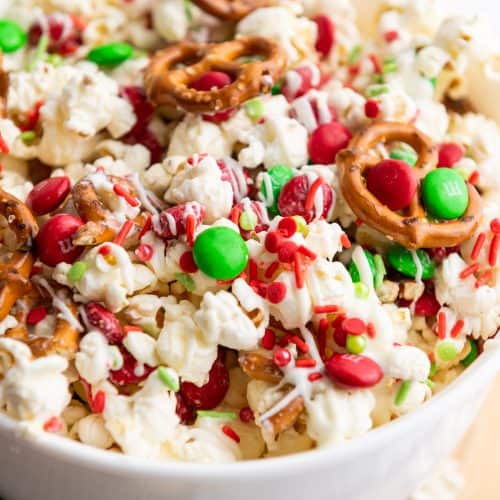 Looking for a fun, festive, and kid-approved treat to make this holiday season? This Christmas Popcorn is the answer! It’s a sweet and salty combo of popcorn, pretzels, M&Ms, and colorful sprinkles all coated in smooth white candy. I love making this for Christmas movie nights, classroom parties, or bagging it up for edible gifts. Best part? It comes together in minutes—no baking required!