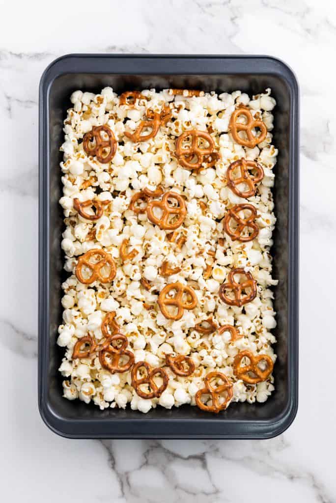 - Add the Pretzels – Break up half the pretzels and scatter both broken and whole pieces over the popcorn.