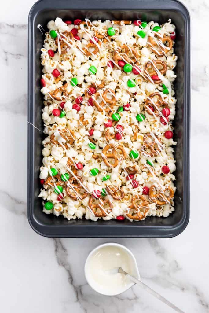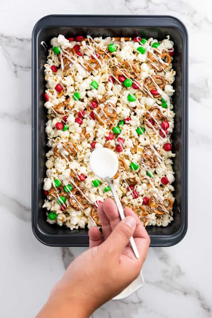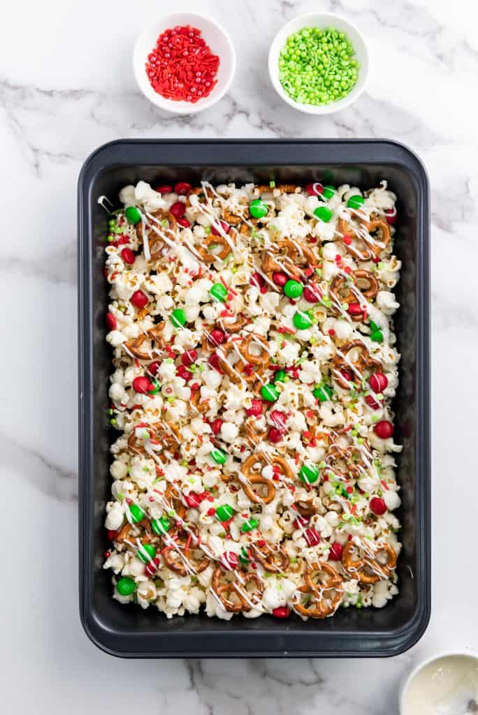 - Drizzle and Toss – Drizzle the melted candy over the popcorn mixture. Immediately sprinkle red and green sprinkles on top and gently toss everything together so the candy coating holds the mix together.