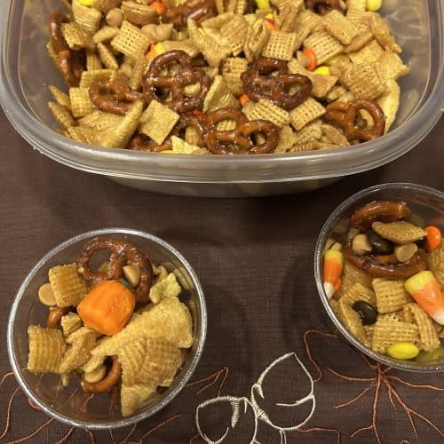 Harvest Crunch Snack Mix is a festive fall snack made with Chex cereal, pretzels, Bugles, candy corn, candy pumpkins, M&Ms, and butterscotch chips. Tossed in a buttery brown sugar glaze and baked for a light crunch, it’s the perfect sweet and salty treat for parties, movie nights, or gifting. Ready in just 30 minutes!