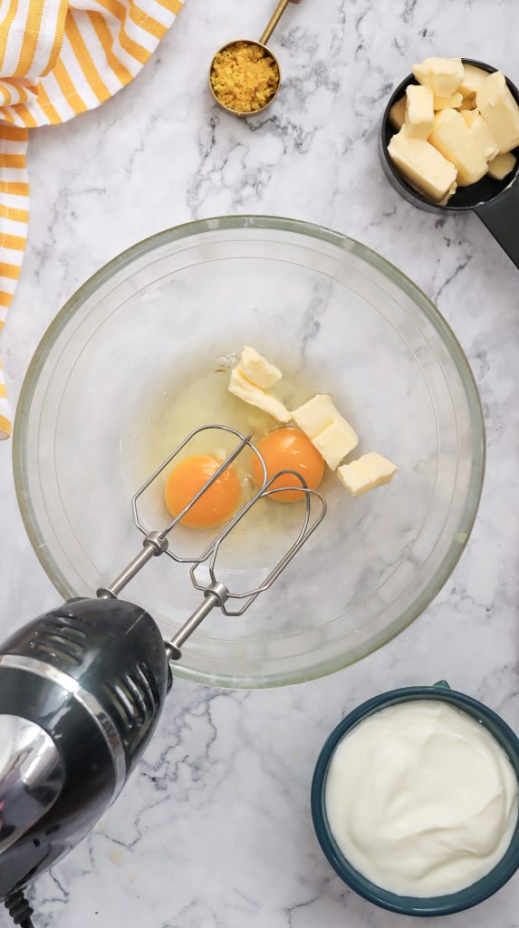 - Add the eggs one at a time, mixing wellafter each addition. Then mix in the vanilla extract and lemon zest.