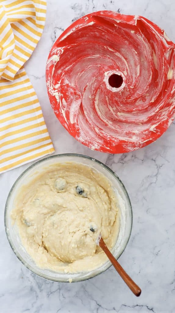 Gently fold in the blueberries tossed in flour. - Pour into Bundt Pan: