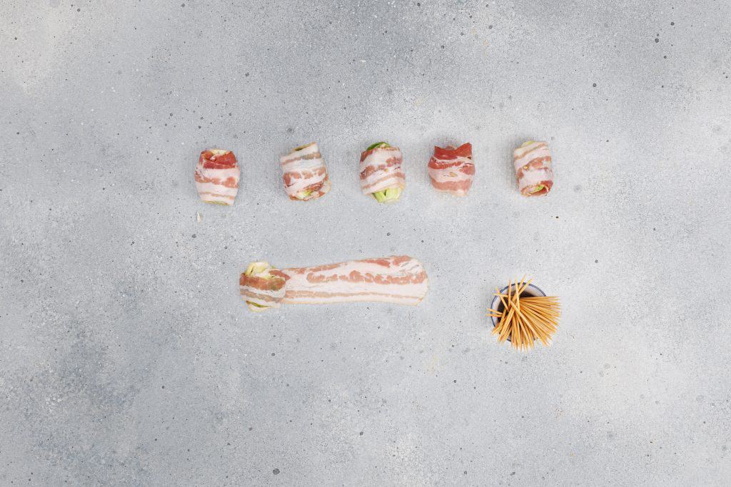- Wrap each sprout with one slice of bacon, securing the ends with a toothpick.
