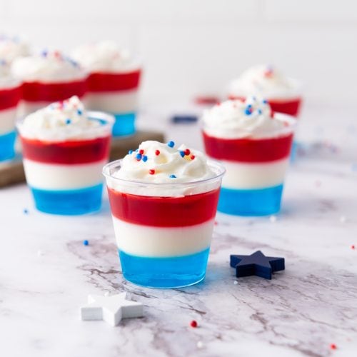 These patriotic Jell-O shots are always a party favorite. With just a bit of patience and layering, you’ll have a tray of beautiful, boozy treats perfect for any celebration. If you make this recipe, let me know how it turned out! Leave a rating and comment below, or tag me on Instagram
