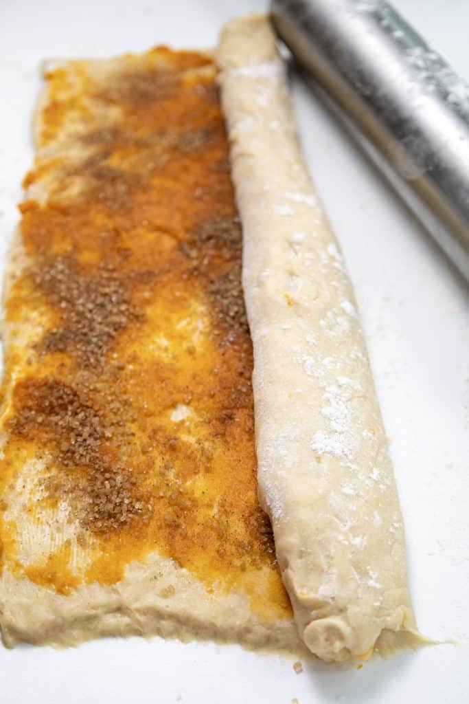 Roll the dough into a rectangle. Spread pumpkin puree evenly across the surface. Mix brown sugar, cinnamon, and nutmeg, then sprinkle over the puree.