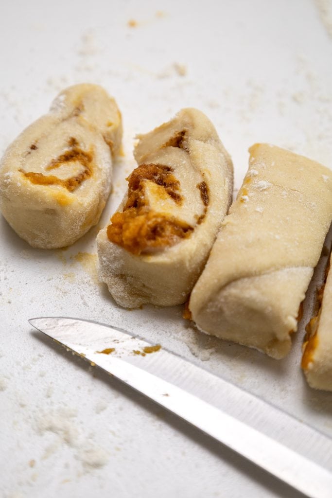 Roll the dough into a log from the long side. Slice into 1-inch thick rolls.